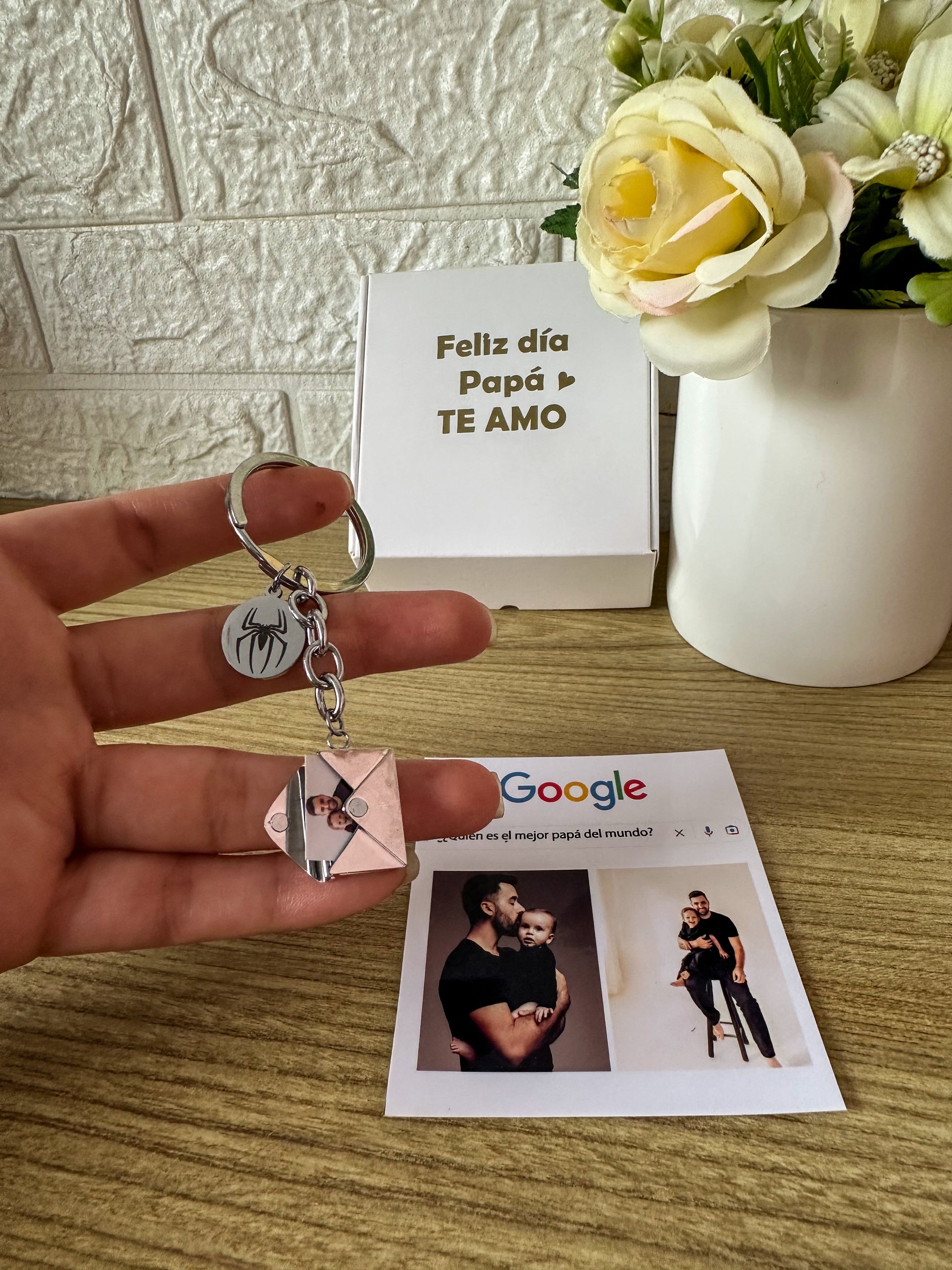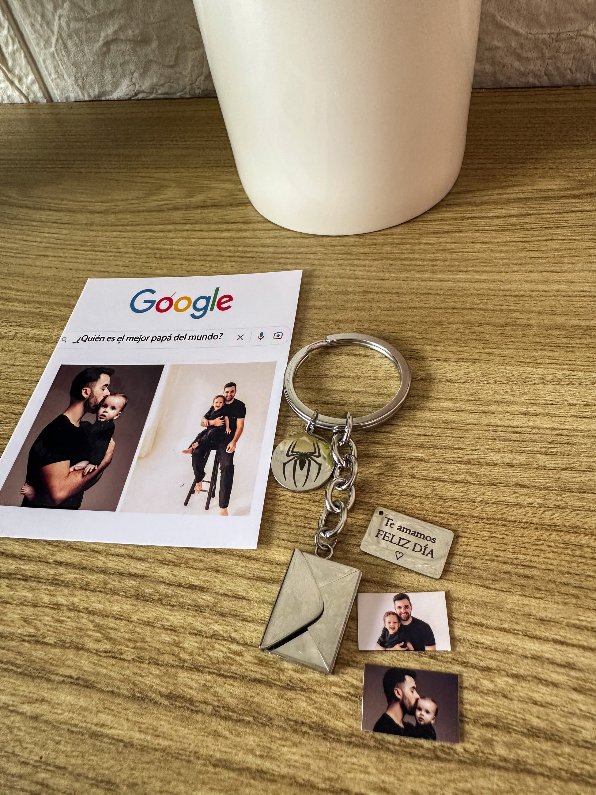 En acero inoxidable, el relicario de sobre lo podemos hacer con dos fotos a tu elección y el grabado de la cartita con tus nombres o fechas especiales, y el dije redondo con el dibujo de tu elección