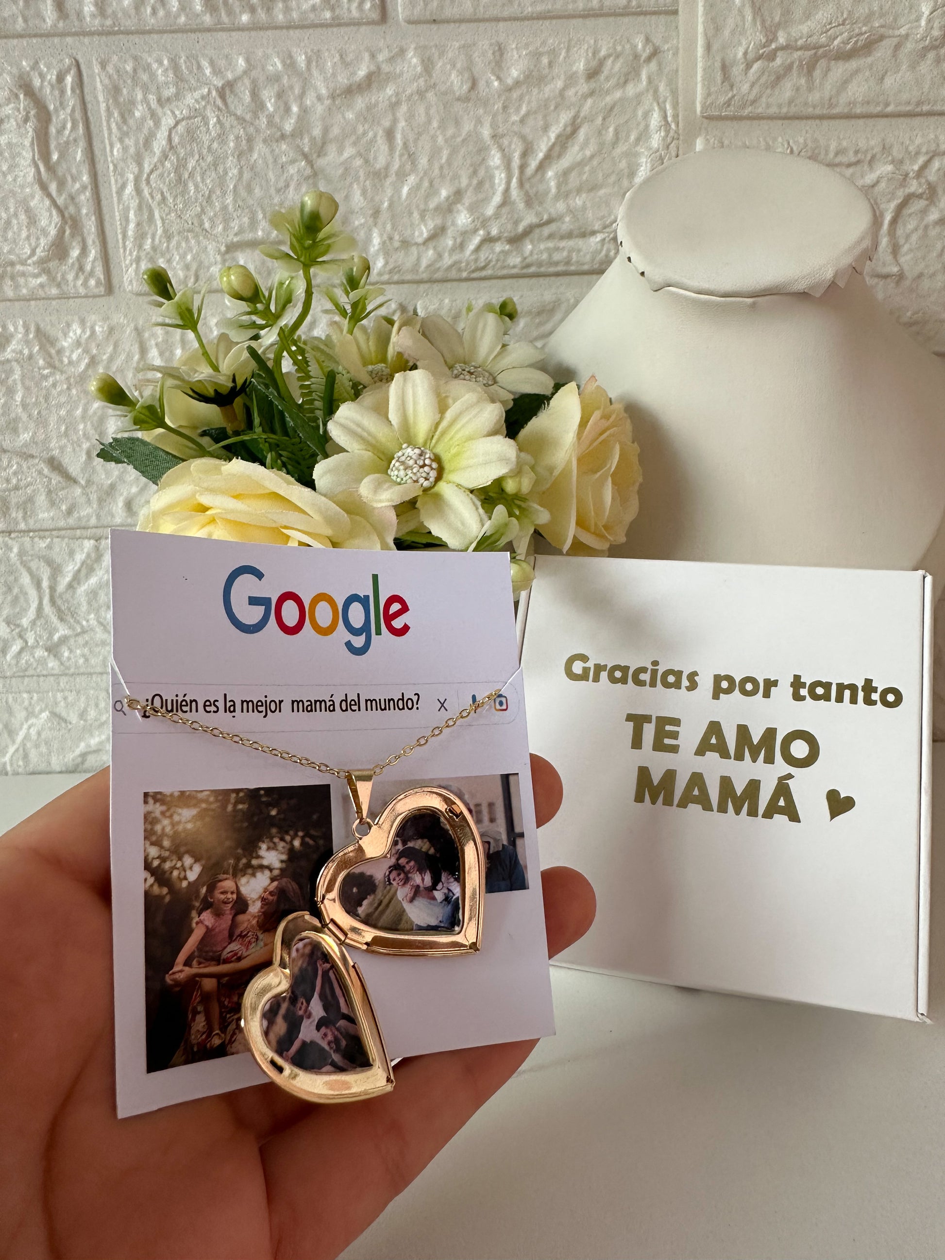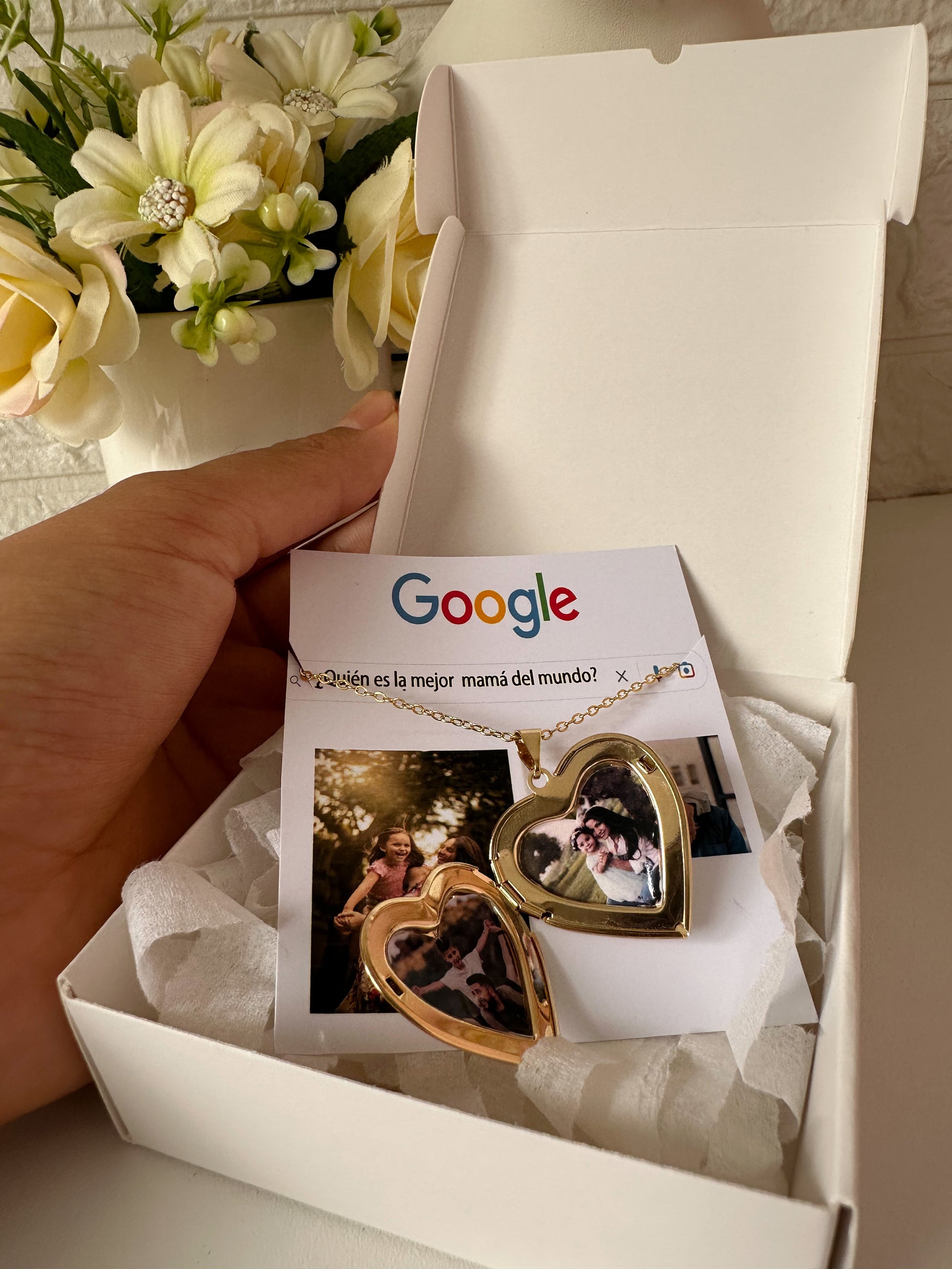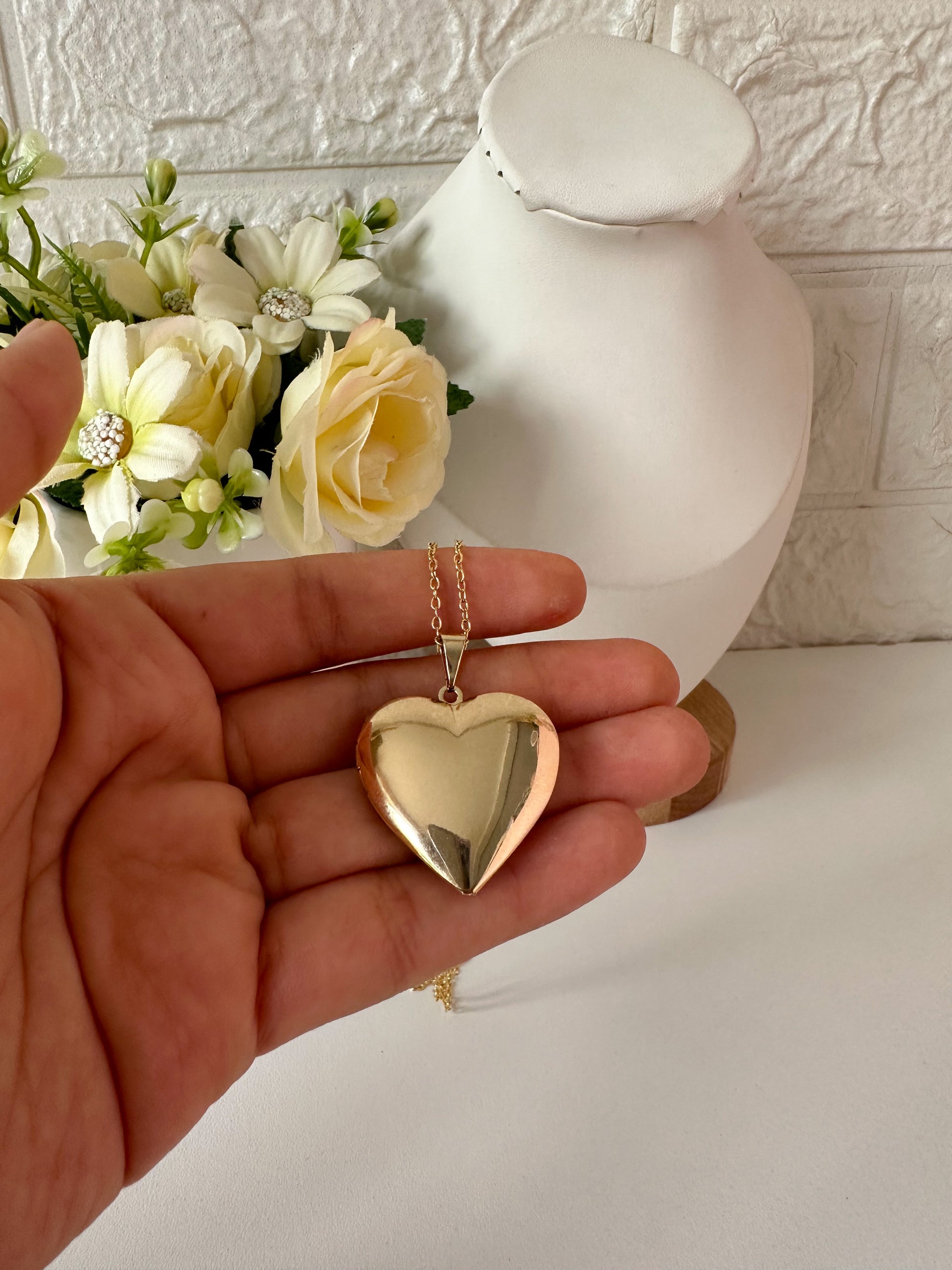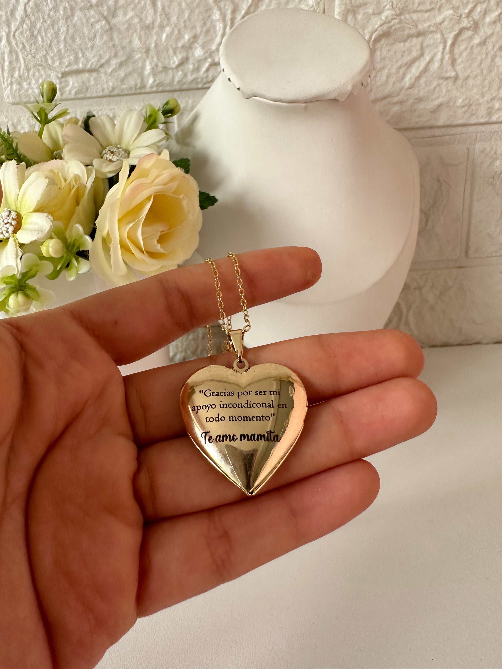 Relicario dorado llano, lo puedes pedir con la dedicatoria pequeña que gustes, nombres o fechas, incluye las dos fotitos personalizadas a tu elección 💕